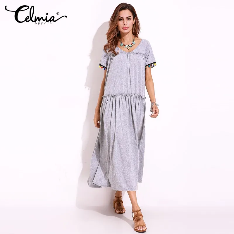 Celmia New Women Long Maxi Dress V Neck Fashion Summer Plain Baggy Loose Casual Beach Pleated Elegant Shift Dresses Plus Size womens-long-maxi-dresses