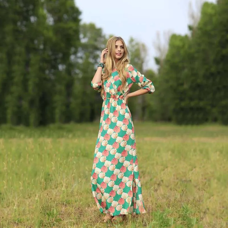 S.FLAVOR Spring Summer Maxi Dress Fashion Women Bohemian Casual Vestidos Long Sleeve V-neck Waist Flower Printing Long Dress womens-long-maxi-dresses