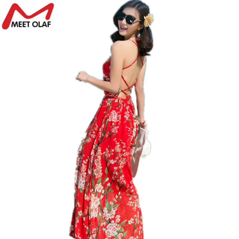 2017 Summer Beach Wear Women Holiday Bohemian Boho Style Floral Print Sexy Halter Back Cross Long Maxi Dress Sleeveless YL601 womens-long-maxi-dresses