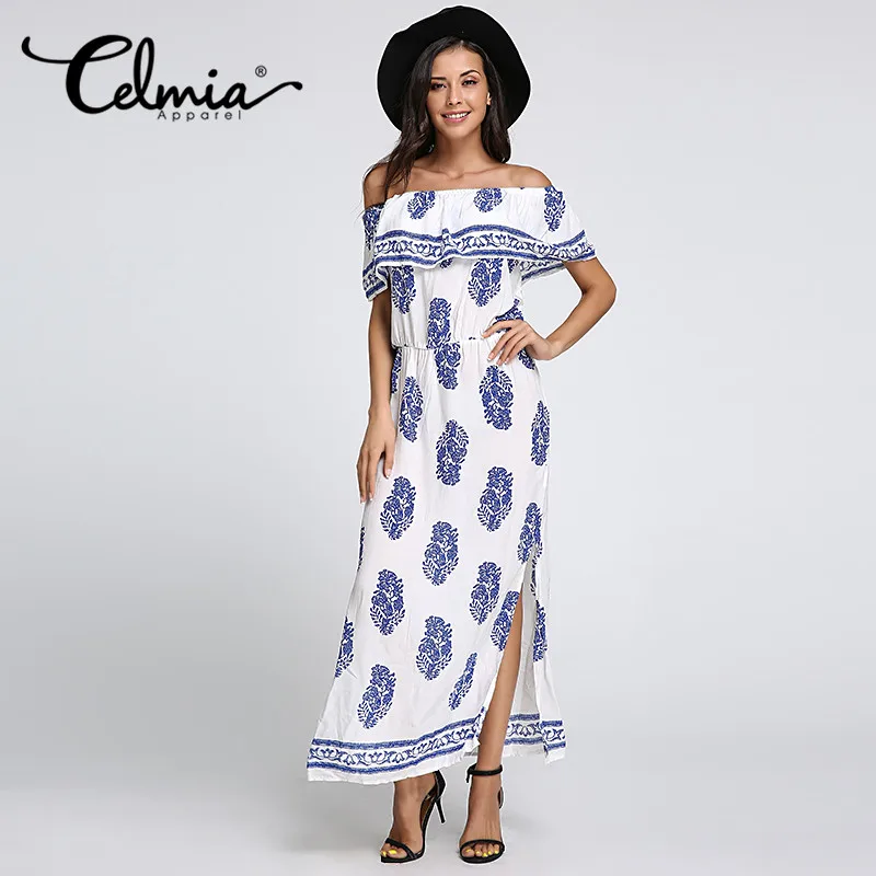 4.7 98 Video Reviews Celmia Plus Size Sexy Off Shoulder Women Long Maxi Dress 2017 Summer Casual Loose Slash Neck Short Sleeve Print Split Dresses womens-long-maxi-dresses