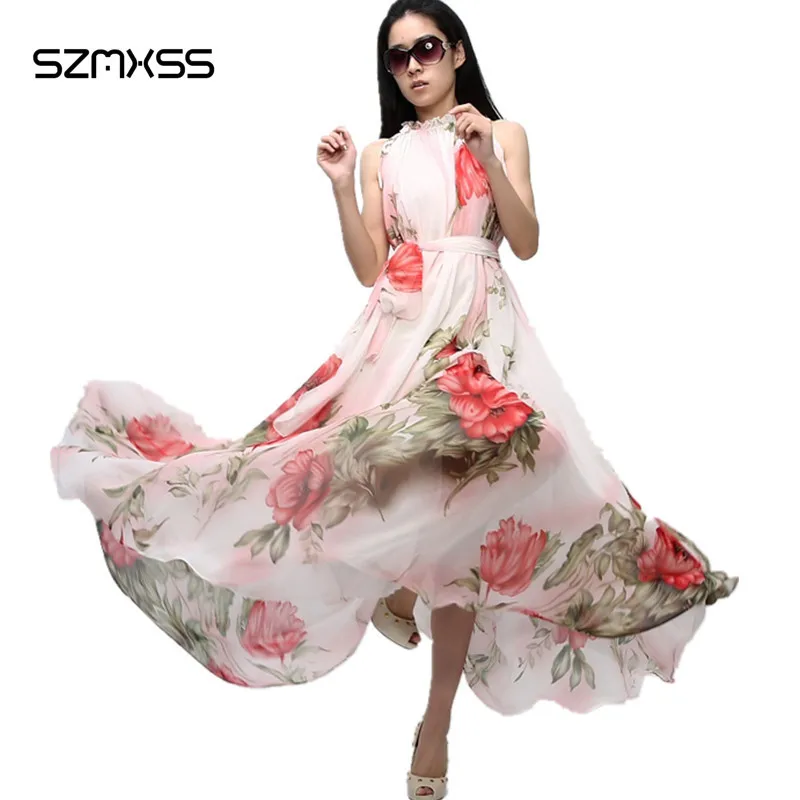 New Chiffon Long Dress Beach Women White Sexy Vestido Longo Floral Chiffon 2017 Summer Boho Maxi Dresses Casual Elegant Dresses womens-long-maxi-dresses