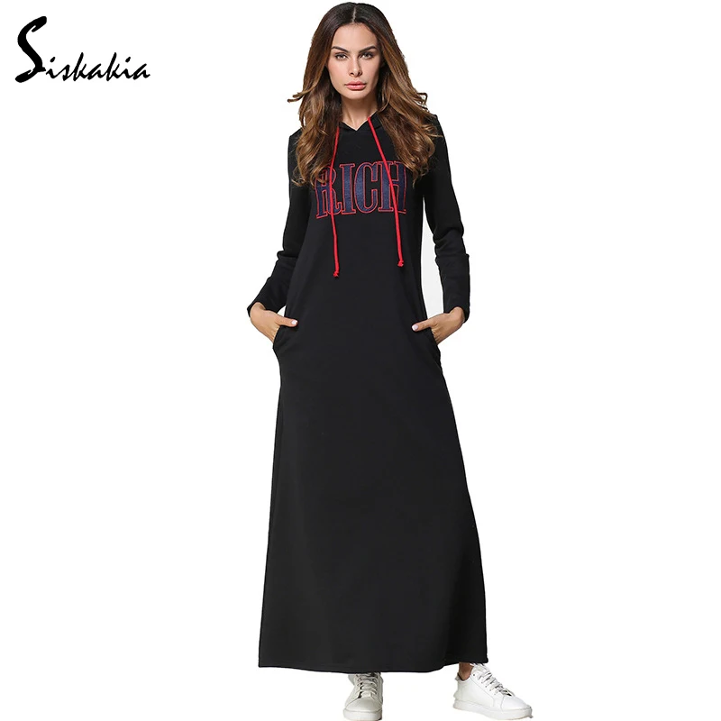 Siskakia Letter printed Hooded long Dress for women Autumn Winter 2017 New Basic Casual slim fit Maxi Dresses with pocket Female womens-long-maxi-dresses