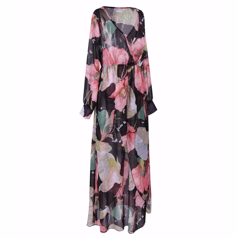 Women Autumn Long Sleeve Maxi Dress V-neck Floral Printing Chiffon Floor-Length Dresses Vestidos Women Tunic Loose Dress womens-long-maxi-dresses
