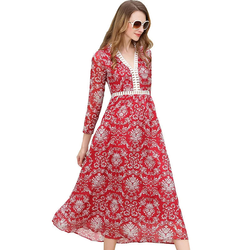 Summer Autumn 2017 Women Long Sleeve Dresses Hollow Out Trim V Neck Chiffon Flower Floral Maxi Dress Vintage Vestidos Longo womens-long-maxi-dresses