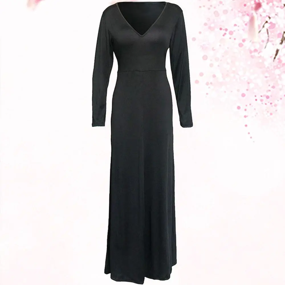 Check Price Plus Size Women Dress Long Sleeve Solid Black V-Neck Female Floor-Length Soft Dress 2017 New Fashion Elegant Party Maxi Dress womens-long-maxi-dresses Online
