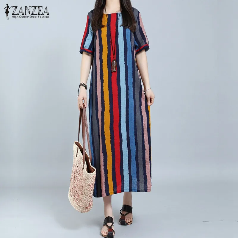 >> Solution Click! <<2Color 2017 ZANZEA Summer Women Short Sleeve Long Maxi Dress Boho Casual Loose O Neck Striped Dresses Vestido De Festa Plus Size womens-long-maxi-dresses