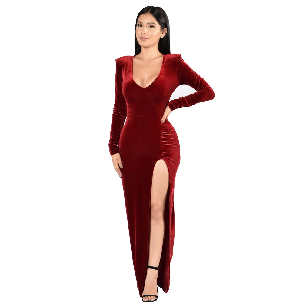 >> Discount Click! <<FD7051 Lady Sheath Velvet Maxi Dress Vestidos Robe Solid Long Sleeve Deep V neck Fold Pleat High Split Sexy Floor Party Dresses womens-long-maxi-dresses