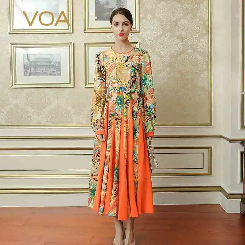 VOA 2017 Fall Orange Boho Women Plus Size Printed Pleated Long Dress Loose High Waist Heavy Silk A Line Maxi Dress ALX16801 womens-long-maxi-dresses