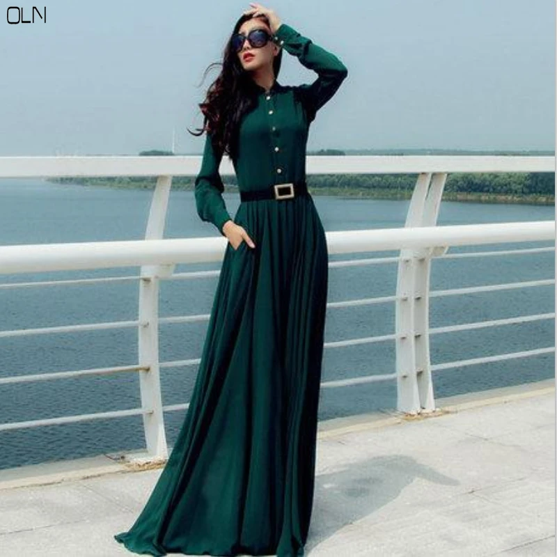 4.9 108 Video Reviews 2017 Beach Holiday Maxi Dresses Shirt Long Sleeve Casual Evening Fashion Party Women Dress Army Green Autumn Winter Vestidos womens-long-maxi-dresses